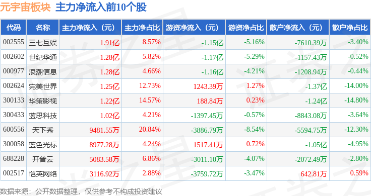 从资金流向上来看,当日元宇宙板块主力资金净流出4.6亿元,游资资金净流出3.68亿元,散户资金净流入8.28亿元。元宇宙板块个股资金流向见下表: