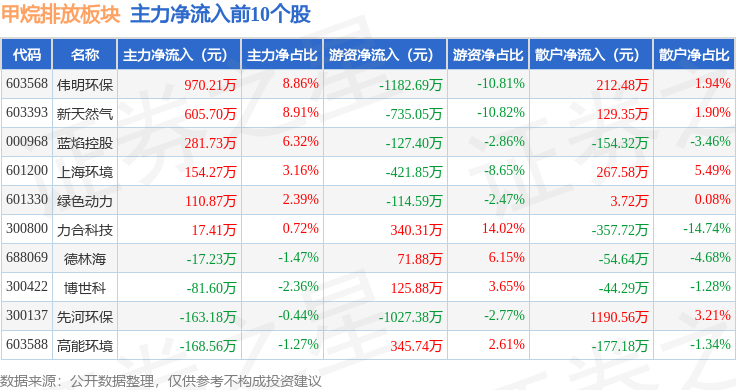 从资金流向上来看,当日甲烷排放板块主力资金净流出4636.45万元,游资资金净流出5270.71万元,散户资金净流入9907.15万元。甲烷排放板块个股资金流向见下表: