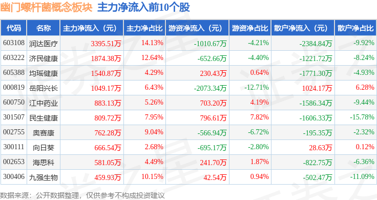 从资金流向上来看,当日幽门螺杆菌概念板块主力资金净流出5071.13万元,游资资金净流出3083.26万元,散户资金净流入8154.39万元。幽门螺杆菌概念板块个股资金流向见下表: