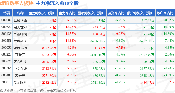从资金流向上来看,当日虚拟数字人板块主力资金净流出316.75万元,游资资金净流出1.23亿元,散户资金净流入1.26亿元。虚拟数字人板块个股资金流向见下表: