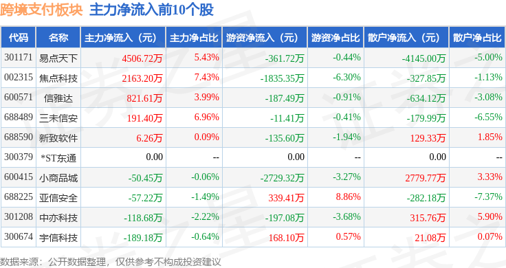 从资金流向上来看,当日跨境支付板块主力资金净流出6.31亿元,游资资金净流入6780.29万元,散户资金净流入5.63亿元。跨境支付板块个股资金流向见下表: