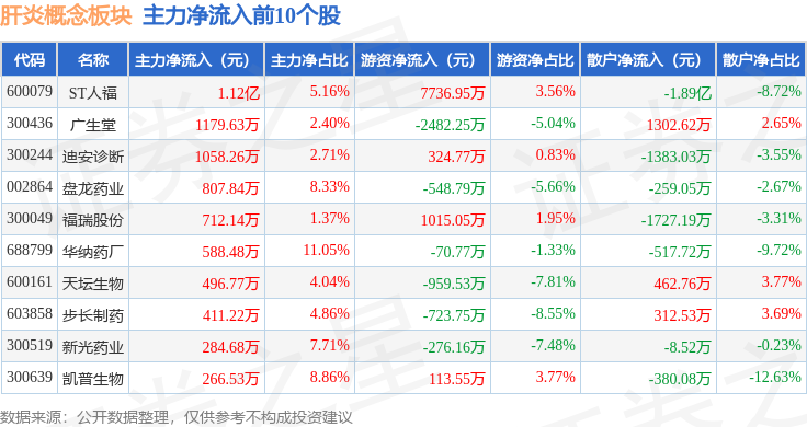 从资金流向上来看,当日肝炎概念板块主力资金净流入9162.45万元,游资资金净流入2337.42万元,散户资金净流出1.15亿元。肝炎概念板块个股资金流向见下表: