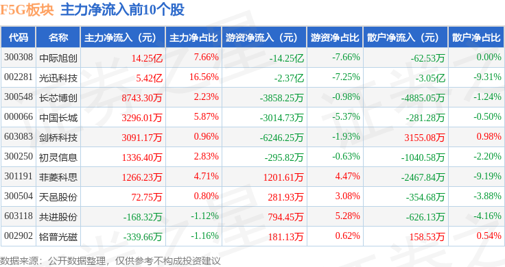 从资金流向上来看,当日F5G板块主力资金净流入13.87亿元,游资资金净流出15.43亿元,散户资金净流入1.55亿元。F5G板块个股资金流向见下表: