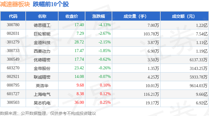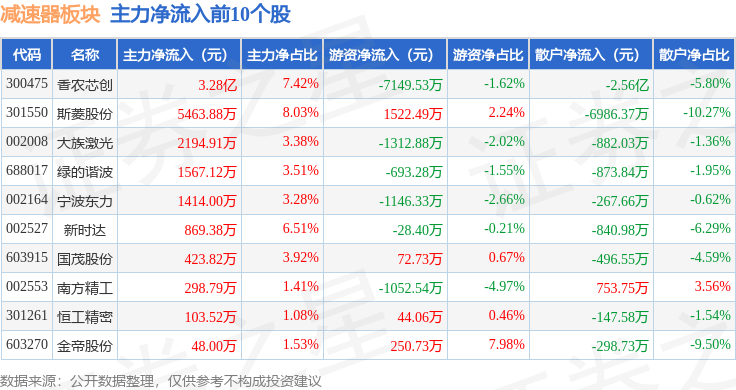 从资金流向上来看,当日减速器板块主力资金净流入1.23亿元,游资资金净流出3.14亿元,散户资金净流入1.91亿元。减速器板块个股资金流向见下表: