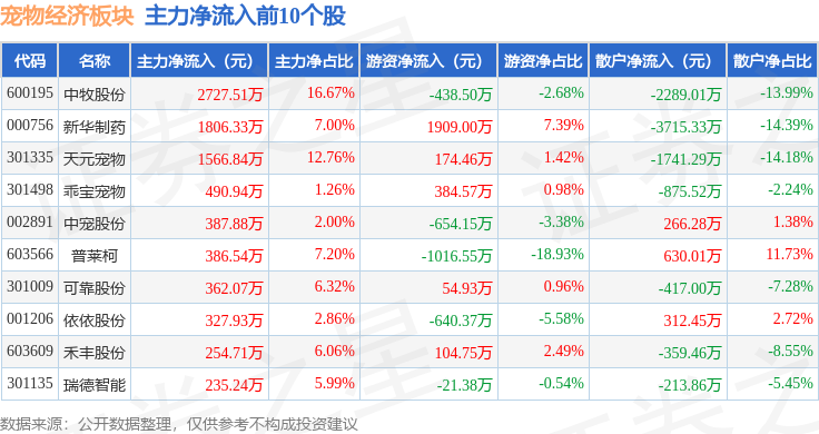 从资金流向上来看,当日宠物经济板块主力资金净流出2.83亿元,游资资金净流出66.25万元,散户资金净流入2.84亿元。宠物经济板块个股资金流向见下表: