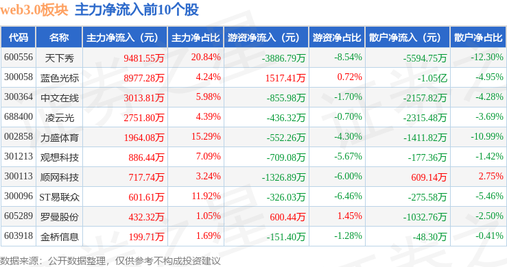 从资金流向上来看,当日web3.0板块主力资金净流出3.73亿元,游资资金净流入7238.03万元,散户资金净流入3.0亿元。web3.0板块个股资金流向见下表: