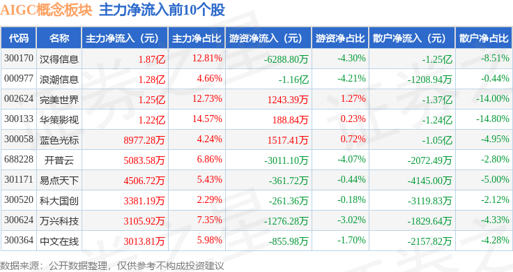从资金流向上来看,当日AIGC概念板块主力资金净流出1.14亿元,游资资金净流出3.26亿元,散户资金净流入4.4亿元。AIGC概念板块个股资金流向见下表: