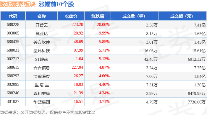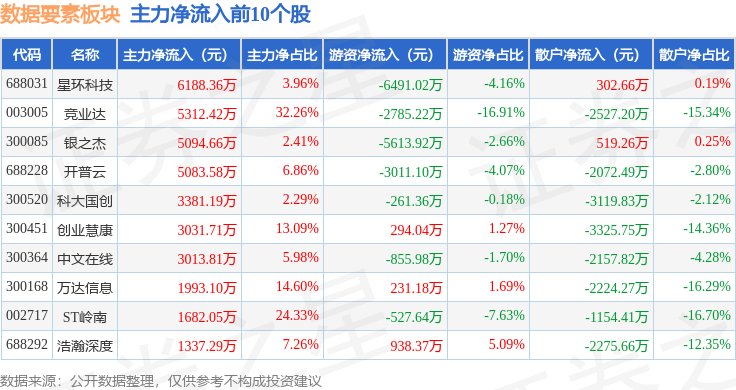 从资金流向上来看,当日数据要素板块主力资金净流出12.73亿元,游资资金净流出2.24亿元,散户资金净流入14.97亿元。数据要素板块个股资金流向见下表:
