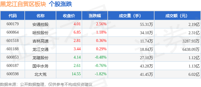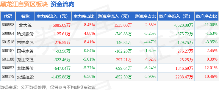 从资金流向上来看,当日黑龙江自贸区板块主力资金净流入3987.92万元,游资资金净流出799.02万元,散户资金净流出3188.89万元。黑龙江自贸区板块个股资金流向见下表: