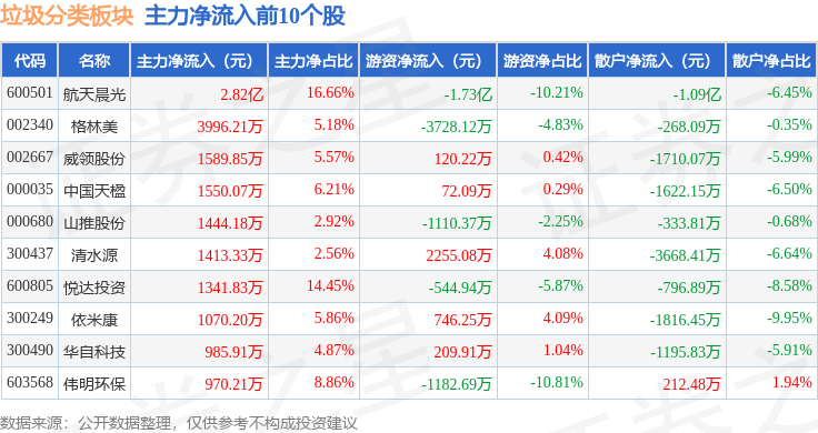 从资金流向上来看,当日垃圾分类板块主力资金净流出1.79亿元,游资资金净流出2.36亿元,散户资金净流入4.15亿元。垃圾分类板块个股资金流向见下表: