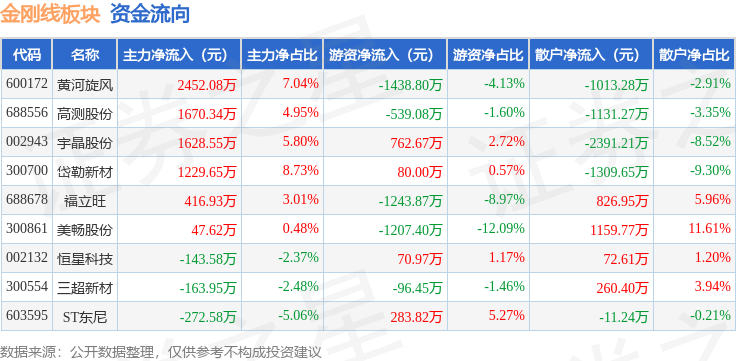从资金流向上来看,当日金刚线板块主力资金净流入6865.06万元,游资资金净流出3328.15万元,散户资金净流出3536.91万元。金刚线板块个股资金流向见下表: