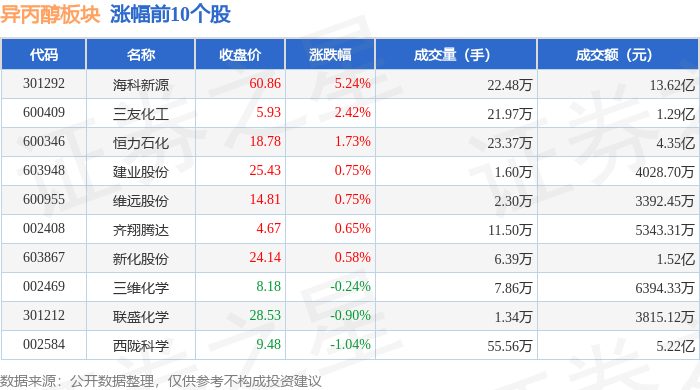 证券之星消息,12月17日异丙醇板块较上一交易日上涨0.93%,海科新源领涨。当日上证指数报收于3870.28,上涨1.19%。深证成指报收于13224.51,上涨2.4%。异丙醇板块个股涨跌见下表: