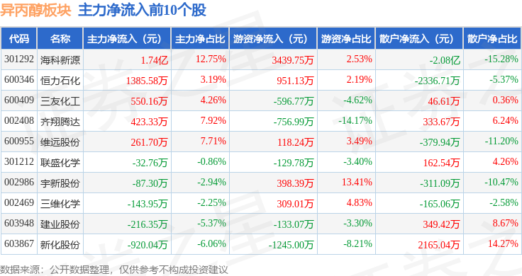 从资金流向上来看,当日异丙醇板块主力资金净流出5239.48万元,游资资金净流入6432.39万元,散户资金净流出1192.91万元。异丙醇板块个股资金流向见下表:
