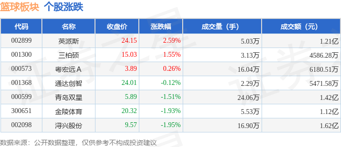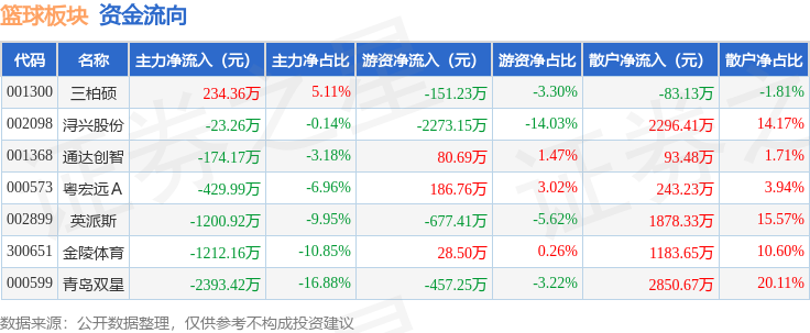 从资金流向上来看,当日篮球板块主力资金净流出5199.57万元,游资资金净流出3263.09万元,散户资金净流入8462.66万元。篮球板块个股资金流向见下表: