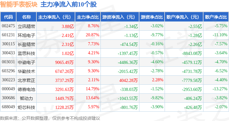 从资金流向上来看,当日智能手表板块主力资金净流入3.06亿元,游资资金净流出1.07亿元,散户资金净流出1.98亿元。智能手表板块个股资金流向见下表: