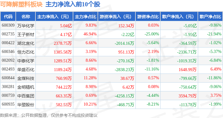 从资金流向上来看,当日可降解塑料板块主力资金净流入7.29亿元,游资资金净流出3.67亿元,散户资金净流出3.62亿元。可降解塑料板块个股资金流向见下表: