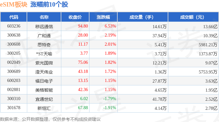 证券之星消息,12月17日eSIM板块较上一交易日上涨1.18%,移远通信领涨。当日上证指数报收于3870.28,上涨1.19%。深证成指报收于13224.51,上涨2.4%。eSIM板块个股涨跌见下表: