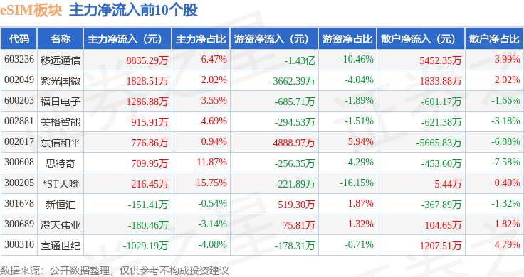 从资金流向上来看,当日eSIM板块主力资金净流出1.71亿元,游资资金净流出1.1亿元,散户资金净流入2.81亿元。eSIM板块个股资金流向见下表:
