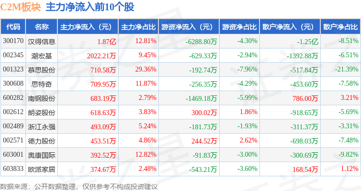 从资金流向上来看,当日C2M板块主力资金净流出2242.62万元,游资资金净流出1334.26万元,散户资金净流入3576.88万元。C2M板块个股资金流向见下表: