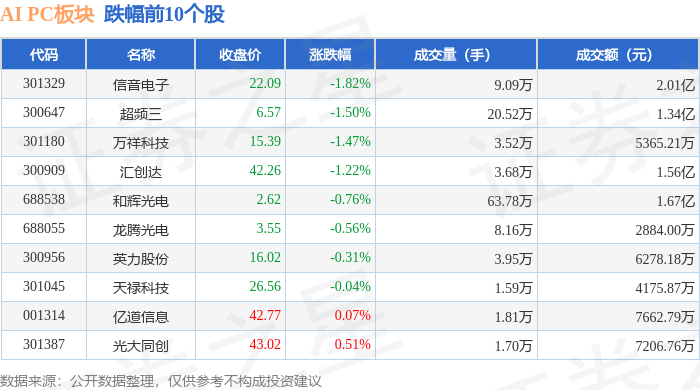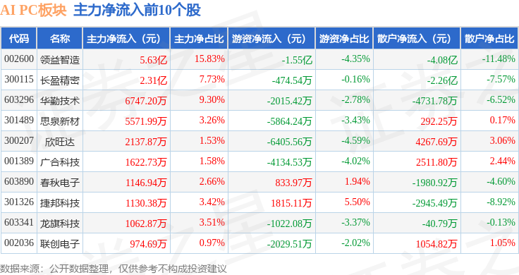 从资金流向上来看,当日AI PC板块主力资金净流入5.37亿元,游资资金净流出2.59亿元,散户资金净流出2.78亿元。AI PC板块个股资金流向见下表: