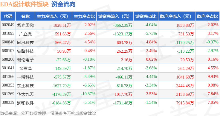 从资金流向上来看,当日EDA设计软件板块主力资金净流出9698.73万元,游资资金净流出6328.67万元,散户资金净流入1.6亿元。EDA设计软件板块个股资金流向见下表: