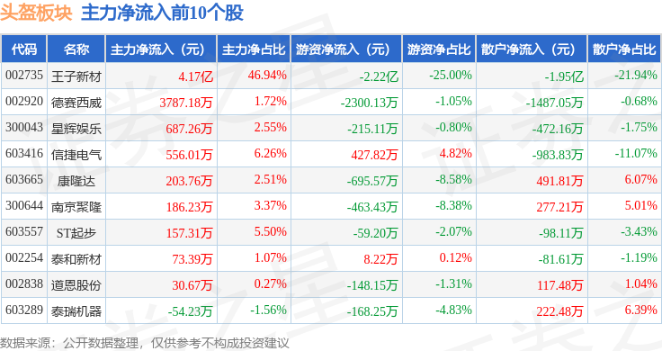 从资金流向上来看,当日头盔板块主力资金净流入9107.39万元,游资资金净流出4.25亿元,散户资金净流入3.34亿元。头盔板块个股资金流向见下表: