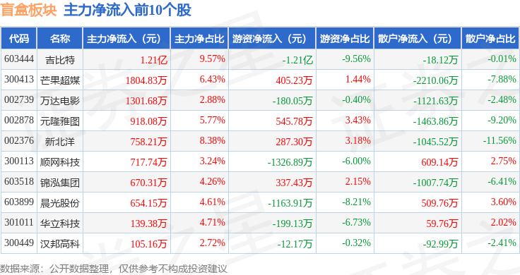 从资金流向上来看,当日盲盒板块主力资金净流入6443.79万元,游资资金净流出1.9亿元,散户资金净流入1.26亿元。盲盒板块个股资金流向见下表: