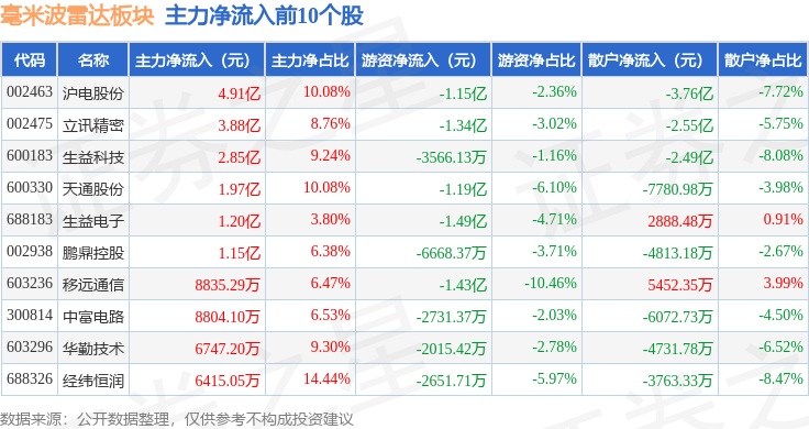 从资金流向上来看,当日毫米波雷达板块主力资金净流出5074.21万元,游资资金净流出5.72亿元,散户资金净流入6.23亿元。毫米波雷达板块个股资金流向见下表: