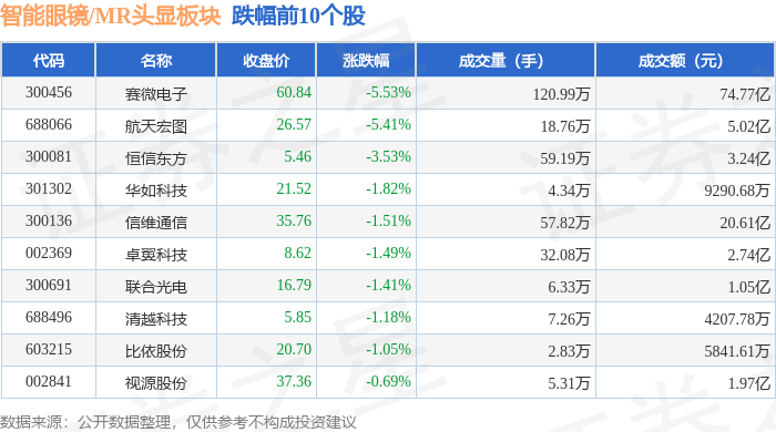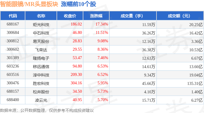 从资金流向上来看,当日智能眼镜/MR头显板块主力资金净流入17.8亿元,游资资金净流出12.28亿元,散户资金净流出5.53亿元。智能眼镜/MR头显板块个股资金流向见下表: