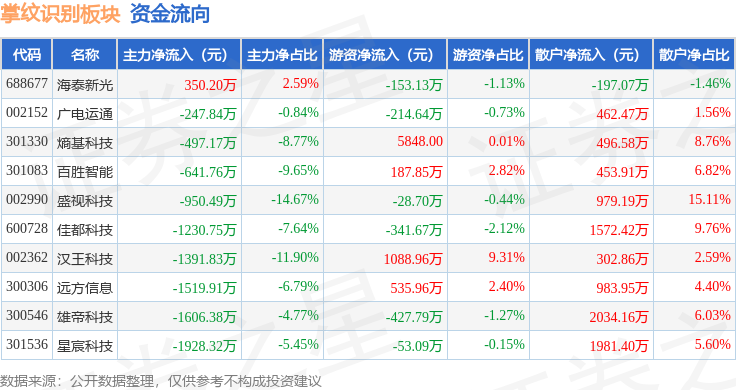 从资金流向上来看,当日掌纹识别板块主力资金净流出9664.23万元,游资资金净流入594.35万元,散户资金净流入9069.88万元。掌纹识别板块个股资金流向见下表: