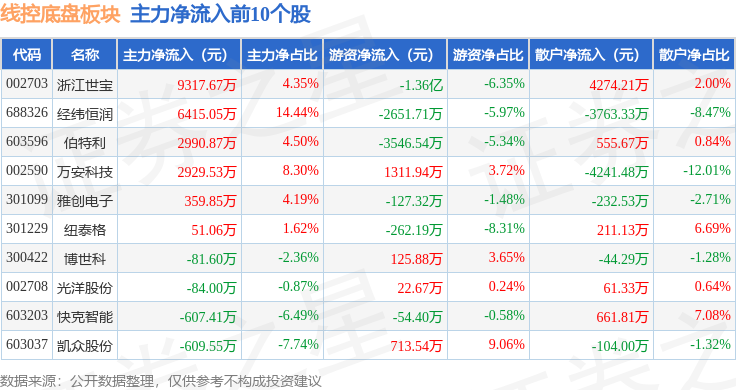 从资金流向上来看,当日线控底盘板块主力资金净流入1.6亿元,游资资金净流出1.78亿元,散户资金净流入1849.52万元。线控底盘板块个股资金流向见下表:
