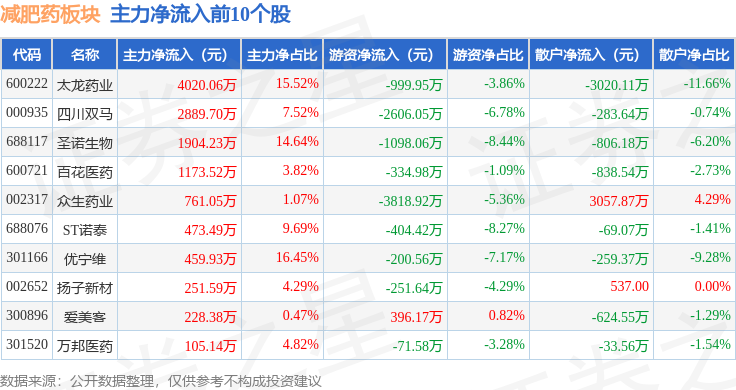 从资金流向上来看,当日减肥药板块主力资金净流出3.13亿元,游资资金净流出9074.03万元,散户资金净流入4.04亿元。减肥药板块个股资金流向见下表: