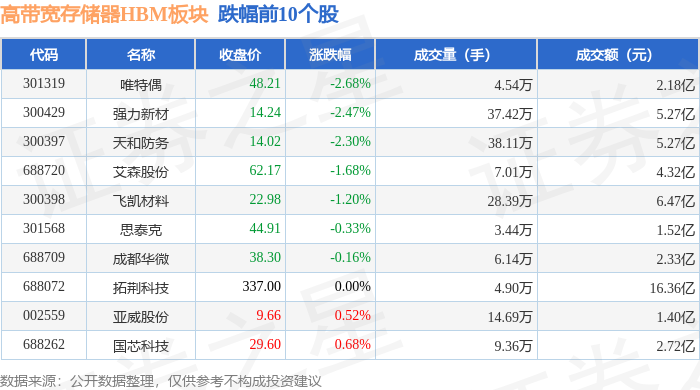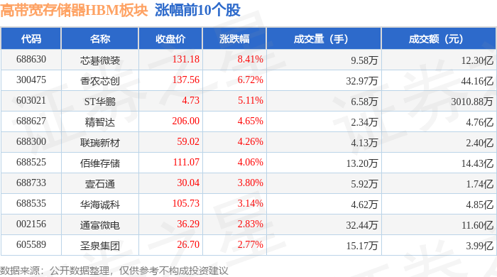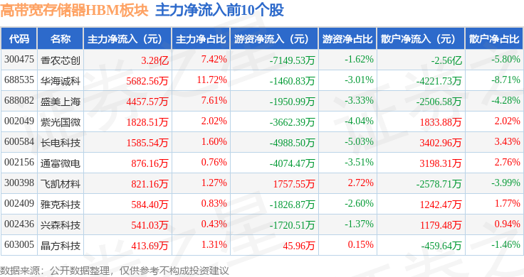 从资金流向上来看,当日高带宽存储器HBM板块主力资金净流出1.21亿元,游资资金净流出1.06亿元,散户资金净流入2.28亿元。高带宽存储器HBM板块个股资金流向见下表: