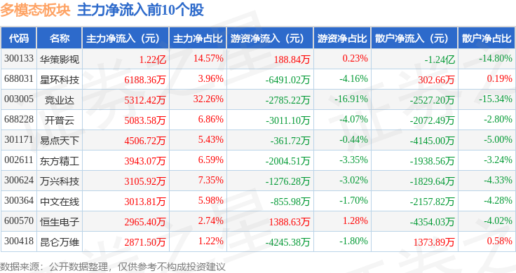 从资金流向上来看,当日多模态板块主力资金净流出8.79亿元,游资资金净流出1.59亿元,散户资金净流入10.38亿元。多模态板块个股资金流向见下表: