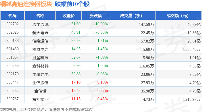 从资金流向上来看,当日铜缆高速连接器板块主力资金净流入3.2亿元,游资资金净流出3.82亿元,散户资金净流入6168.84万元。铜缆高速连接器板块个股资金流向见下表: