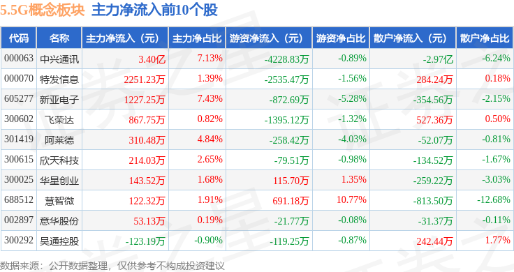 从资金流向上来看,当日5.5G概念板块主力资金净流出13.88亿元,游资资金净流入4.63亿元,散户资金净流入9.25亿元。5.5G概念板块个股资金流向见下表: