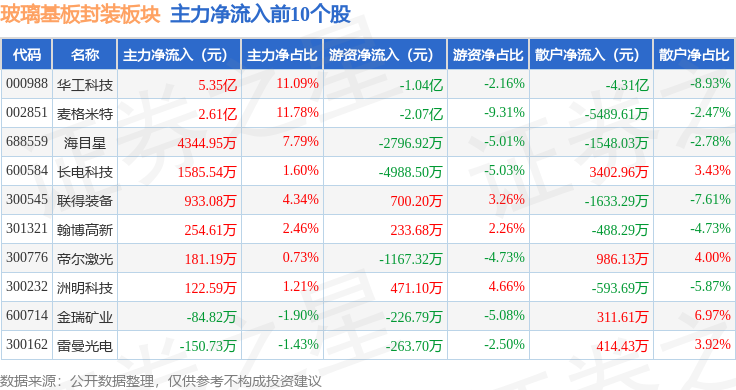 从资金流向上来看,当日玻璃基板封装板块主力资金净流入7.55亿元,游资资金净流出3.93亿元,散户资金净流出3.62亿元。玻璃基板封装板块个股资金流向见下表:
