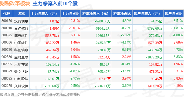 从资金流向上来看,当日财税改革板块主力资金净流出3.54亿元,游资资金净流出1.33亿元,散户资金净流入4.87亿元。财税改革板块个股资金流向见下表: