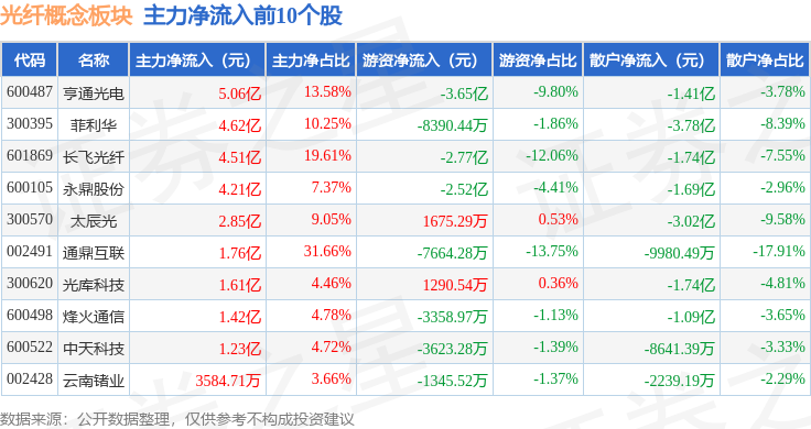 从资金流向上来看,当日光纤概念板块主力资金净流入25.01亿元,游资资金净流出11.87亿元,散户资金净流出13.14亿元。光纤概念板块个股资金流向见下表: