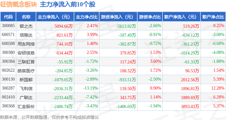从资金流向上来看,当日征信概念板块主力资金净流出5.72亿元,游资资金净流入3210.8万元,散户资金净流入5.4亿元。征信概念板块个股资金流向见下表: