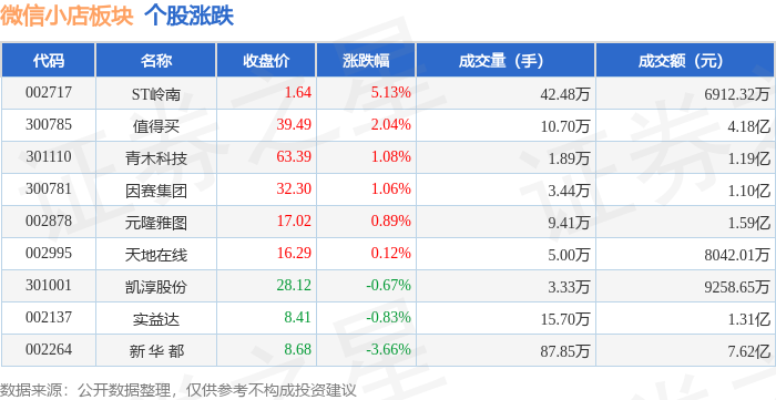 证券之星消息,12月17日微信小店板块较上一交易日上涨0.3%,ST岭南领涨。当日上证指数报收于3870.28,上涨1.19%。深证成指报收于13224.51,上涨2.4%。微信小店板块个股涨跌见下表: