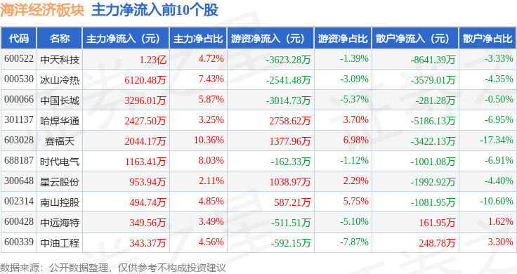 从资金流向上来看,当日海洋经济板块主力资金净流出13.29亿元,游资资金净流出9297.67万元,散户资金净流入14.22亿元。海洋经济板块个股资金流向见下表: