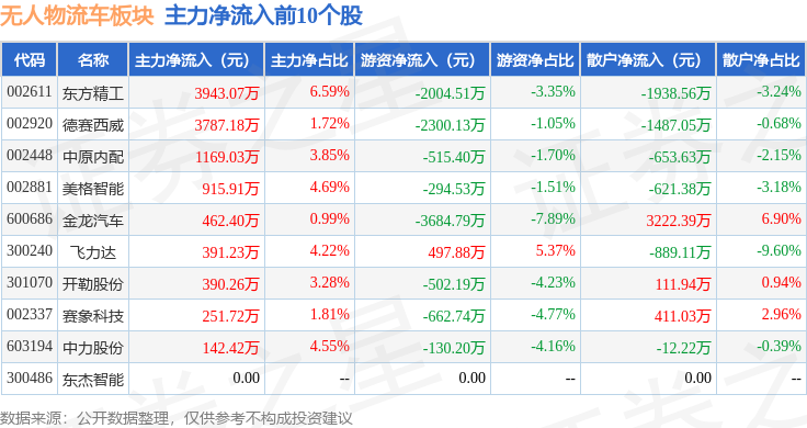 从资金流向上来看,当日无人物流车板块主力资金净流出4.14亿元,游资资金净流出1571.59万元,散户资金净流入4.29亿元。无人物流车板块个股资金流向见下表:
