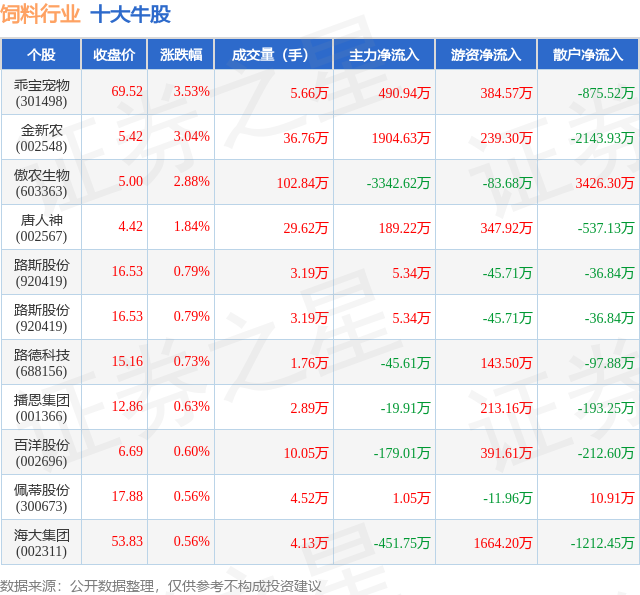 个股表现方面,饲料行业当日领涨股为乖宝宠物(301498),该股当日报收69.52,上涨3.53%,成交量5.66万,主力资金净流入490.94万元。金新农(002548)以上涨3.04%紧随其后,该股当日成交量36.76万,主力资金净流入1904.63万元。除此之外,傲农生物(603363)、唐人神(002567)、路斯股份(920419)均进入当日牛股之列。具体个股列表见下表: