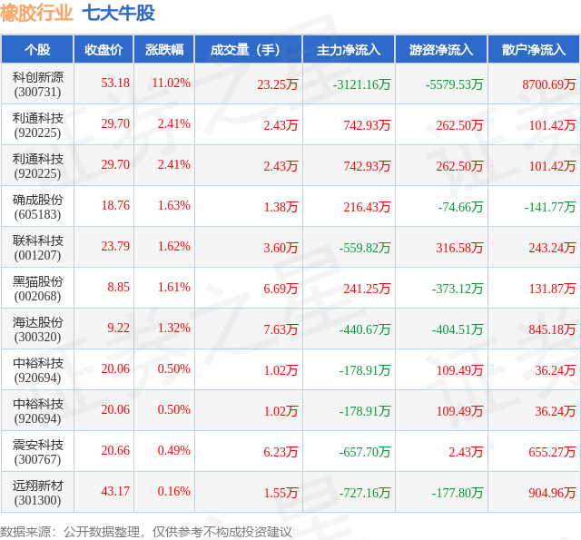 个股表现方面,橡胶行业当日领涨股为科创新源(300731),该股当日报收53.18,上涨11.02%,成交量23.25万,主力资金净流出3121.16万元。利通科技(920225)以上涨2.41%紧随其后,该股当日成交量2.43万,主力资金净流入742.93万元。除此之外,利通科技(920225)、确成股份(605183)、联科科技(001207)均进入当日牛股之列。具体个股列表见下表: