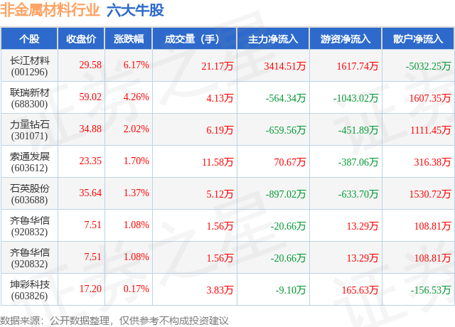 个股表现方面,非金属材料行业当日领涨股为长江材料(001296),该股当日报收29.58,上涨6.17%,成交量21.17万,主力资金净流入3414.51万元。联瑞新材(688300)以上涨4.26%紧随其后,该股当日成交量4.13万,主力资金净流出564.34万元。除此之外,力量钻石(301071)、索通发展(603612)、石英股份(603688)均进入当日牛股之列。具体个股列表见下表: