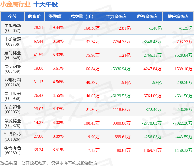 个股表现方面,小金属行业当日领涨股为中钨高新(000657),该股当日报收28.51,上涨9.44%,成交量168.38万,主力资金净流入2.81亿元。中矿资源(002738)以上涨8.58%紧随其后,该股当日成交量37.74万,主力资金净流入7754.75万元。除此之外,厦门钨业(600549)、贵研铂业(600459)、西部材料(002149)均进入当日牛股之列。具体个股列表见下表:
