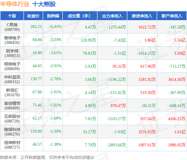 个股表现方面,半导体行业当日领跌股为C昂瑞(688790),该股当日报收202.21,下跌6.41%,成交量4.47万,主力资金净流出1275.44万元。赛微电子(300456)以下跌5.53%紧随其后,该股当日成交量120.99万,主力资金净流出7.42亿元。除此之外,航宇微(300053)、明微电子(688699)、中科蓝讯(688332)均进入当日熊股之列。具体个股列表见下表: