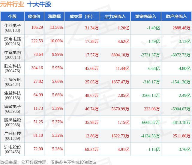 个股表现方面,元件行业当日领涨股为生益电子(688183),该股当日报收106.29,上涨13.56%,成交量31.34万,主力资金净流入1.2亿元。深南电路(002916)以上涨10.0%紧随其后,该股当日成交量17.28万,主力资金净流入4.62亿元。除此之外,中富电路(300814)、胜宏科技(300476)、江海股份(002484)均进入当日牛股之列。具体个股列表见下表: