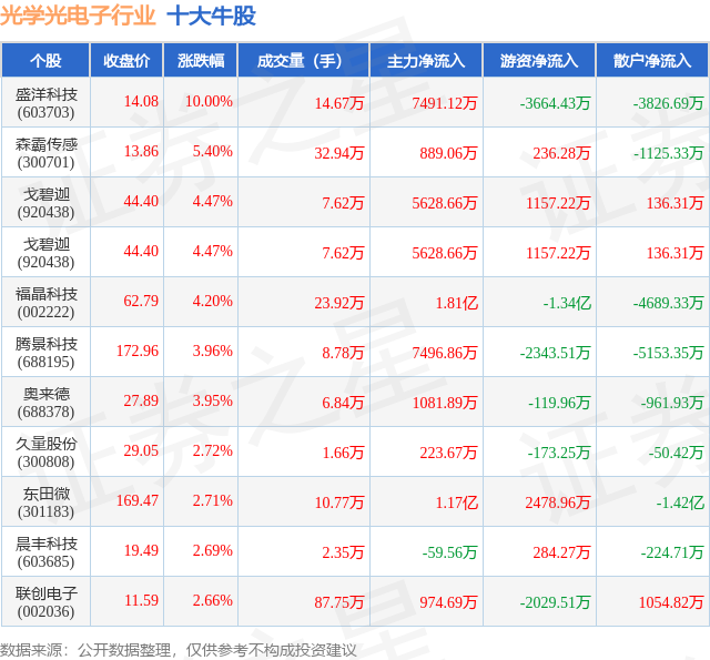 个股表现方面,光学光电子行业当日领涨股为盛洋科技(603703),该股当日报收14.08,上涨10.0%,成交量14.67万,主力资金净流入7491.12万元。森霸传感(300701)以上涨5.4%紧随其后,该股当日成交量32.94万,主力资金净流入889.06万元。除此之外,戈碧迦(920438)、戈碧迦(920438)、福晶科技(002222)均进入当日牛股之列。具体个股列表见下表: